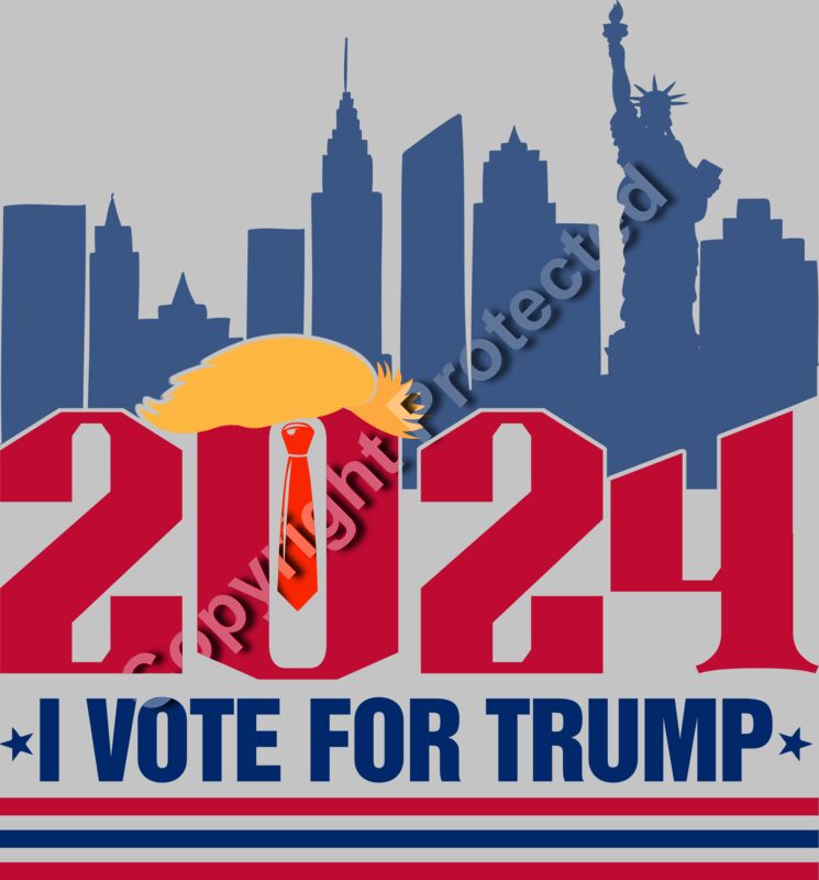 Trump 2024 campaign graphic with skyscrapers and text I VOTE FOR TRUMP in bold colors