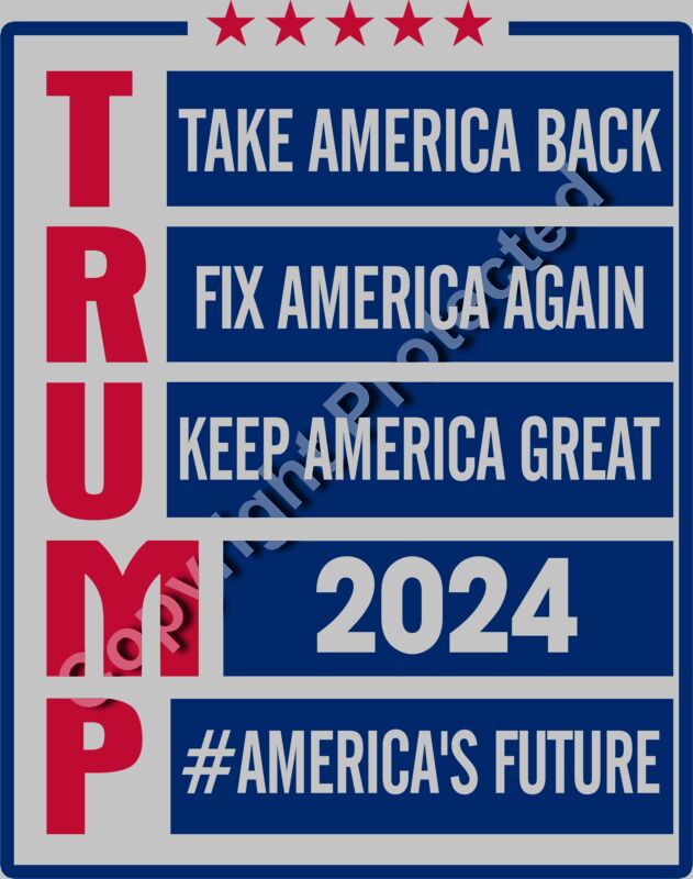 Trump 2024 campaign themes graphic with patriotic colors and slogans